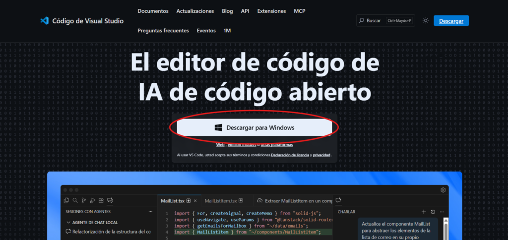 Ve a code.visualstudio.com y descarga la versión para Windows. La instalación es siguiente, siguiente, siguiente, aquí no hay trampas como con Python.