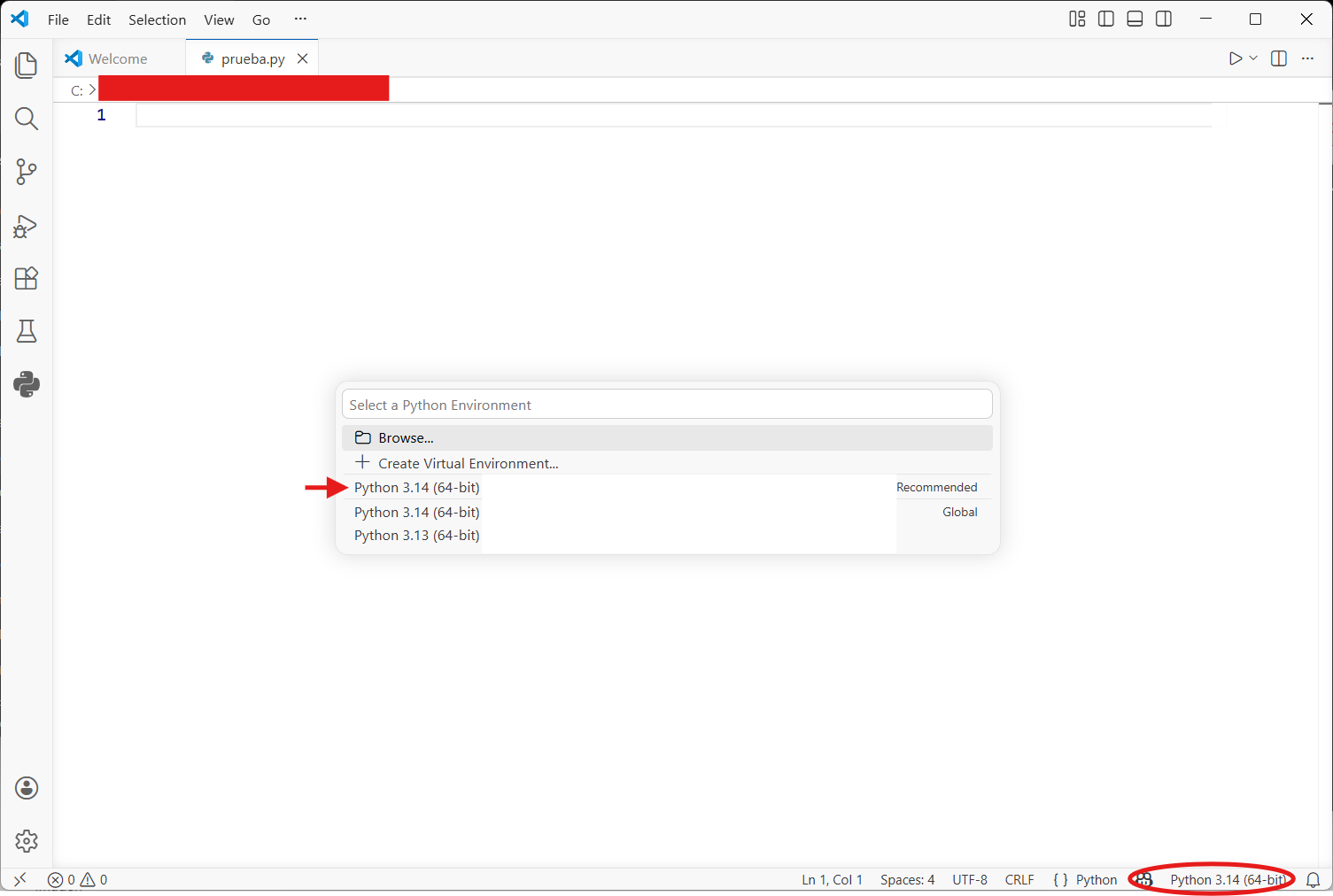 Abre VS Code, crea un archivo nuevo y guárdalo como prueba.py. En la esquina inferior derecha verás que dice el intérprete de Python seleccionado. Haz clic ahí y selecciona la versión de Python que instalaste. Si no aparece, cierra VS Code y vuelve a abrirlo.