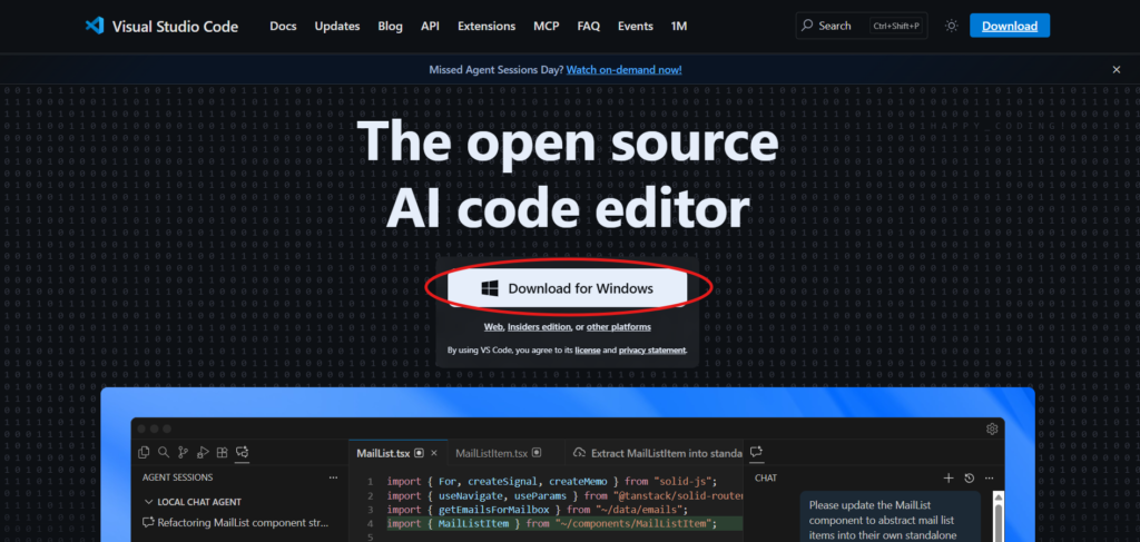 Go to code.visualstudio.com and download the Windows version. The installation is next, next, next, no tricks here like with Python.