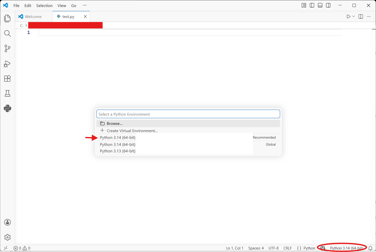Open VS Code, create a new file and save it as test.py. In the bottom right corner you’ll see the selected Python interpreter. Click it and select the Python version you installed. If it doesn’t appear, close VS Code and reopen it.