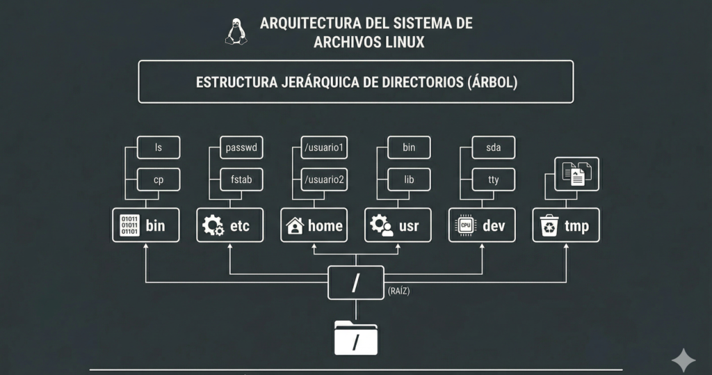 / ├── bin → comandos esenciales del sistema ├── etc → archivos de configuración ├── home → carpetas personales de usuarios (/home/sergio) ├── dev → dispositivos (discos, USB, pantalla) ├── usr → programas instalados ├── var → archivos variables (logs, caché) ├── tmp → archivos temporales └── mnt → puntos de montaje (discos externos)