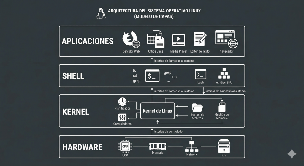 Shell — la capa que tú sí ves y usas. Recibe tus órdenes en texto y las traduce para que el kernel las ejecute.