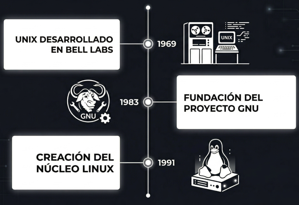 No hace falta que te aprendas toda la historia de Unix para aprobar IC2, pero hay tres hitos que explican por qué Linux existe y cómo llegó a ser lo que es: